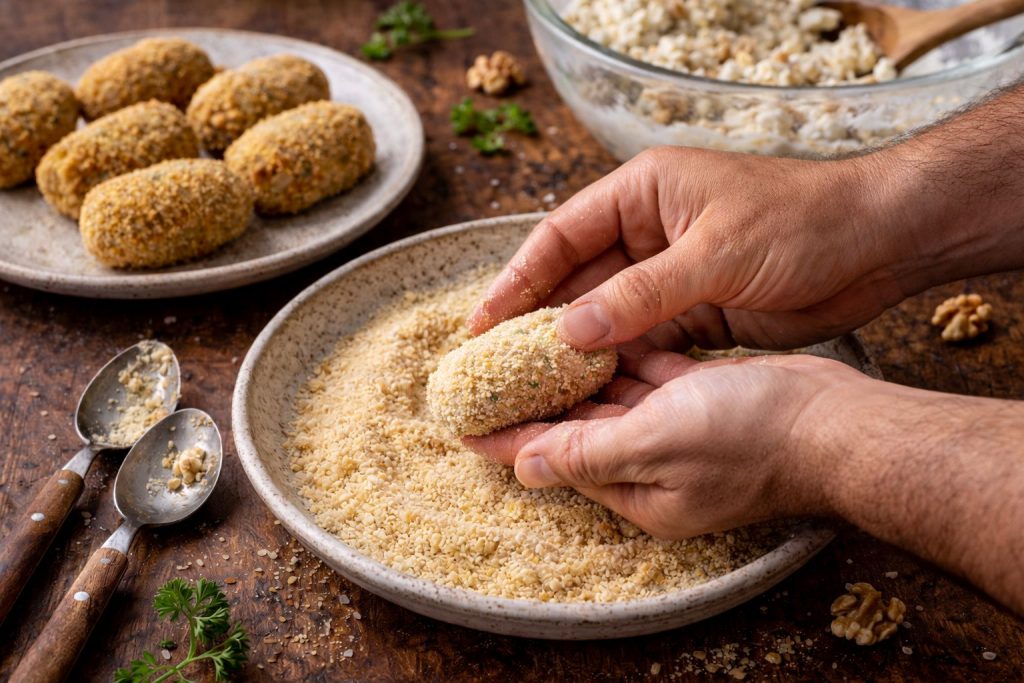 Con las manos húmedas o dos cucharas, forma las croquetas del tamaño deseado. Pásalas por pan rallado. Si prefieres un empanado más crujiente, puedes hacer doble pasada: huevo batido + pan rallado.