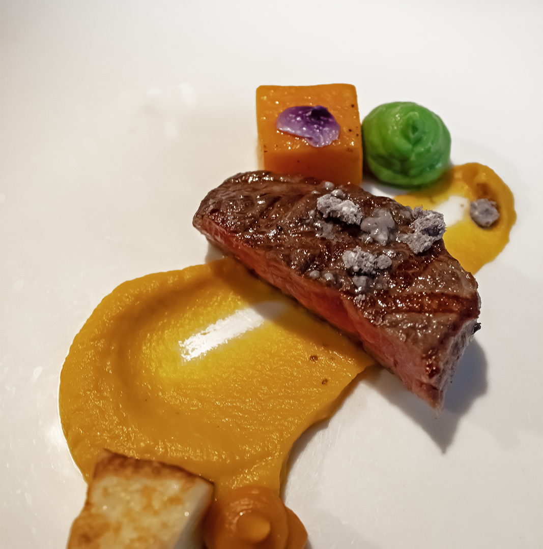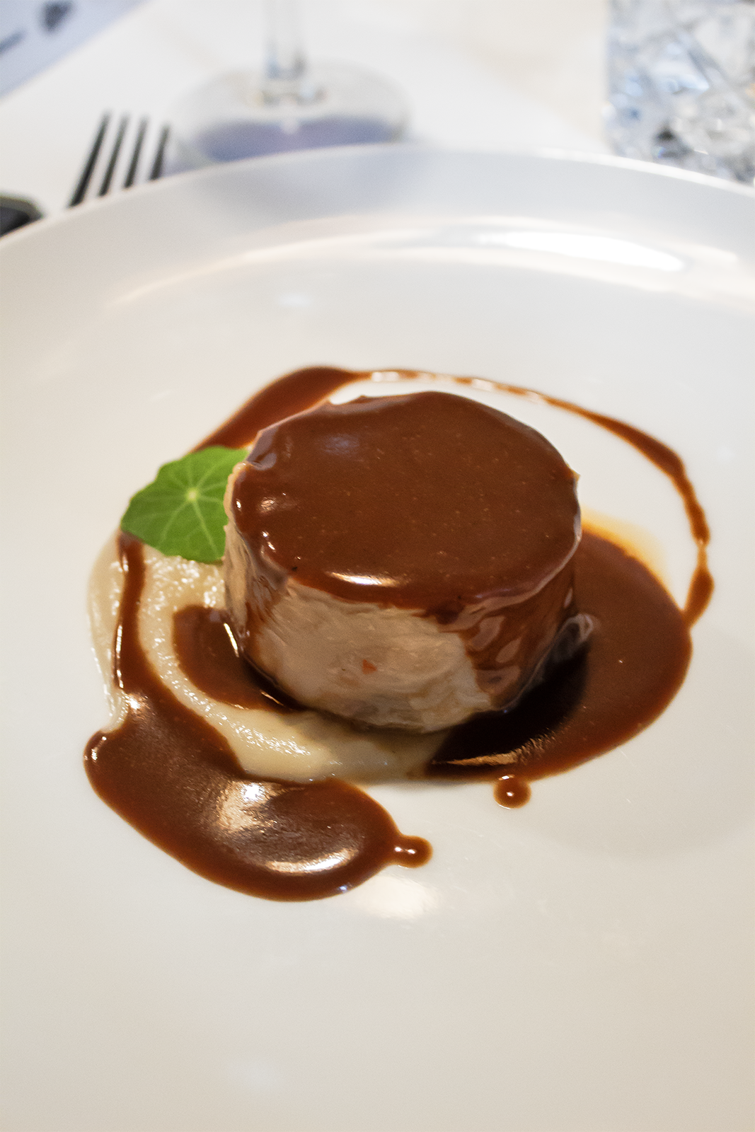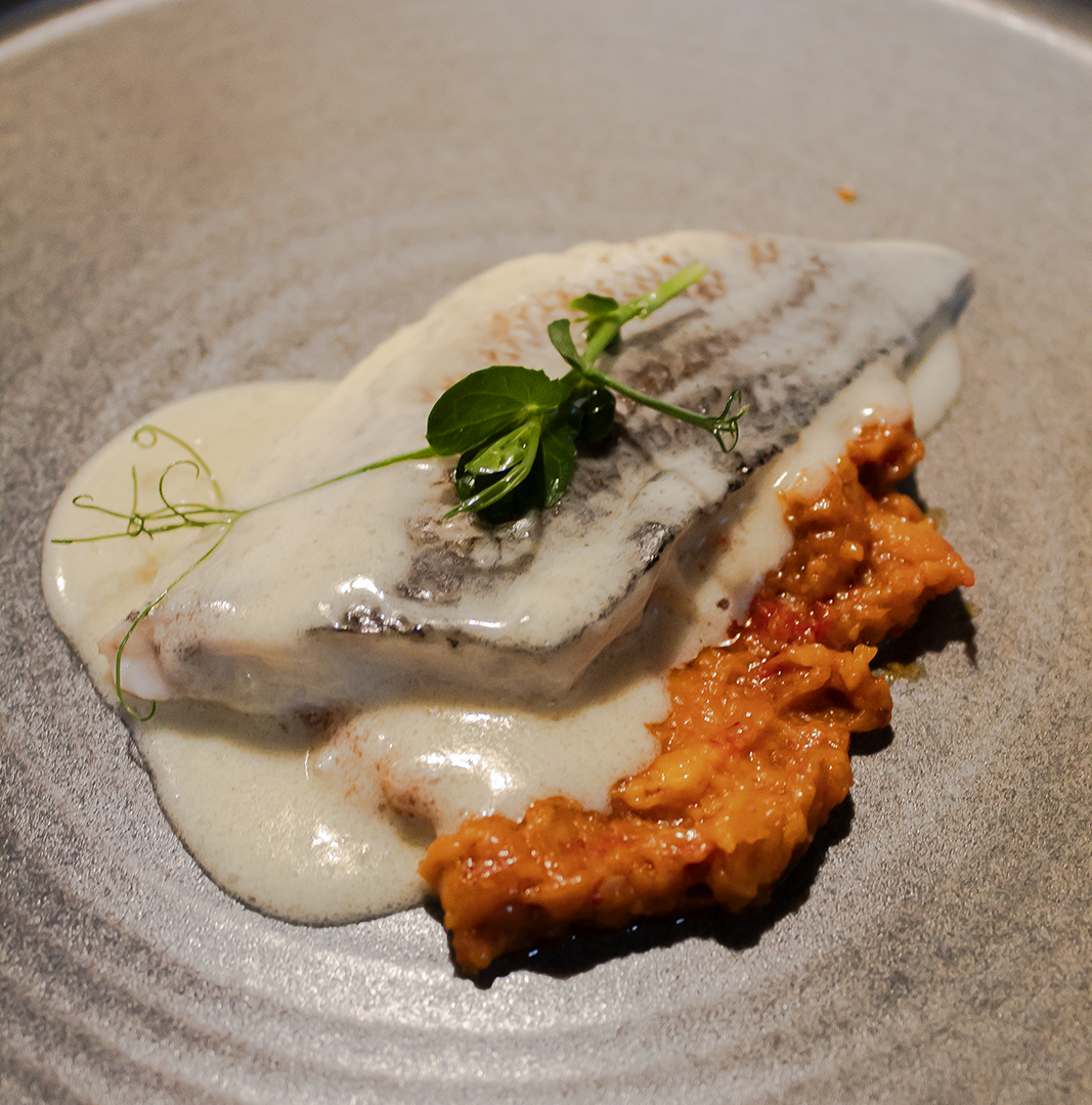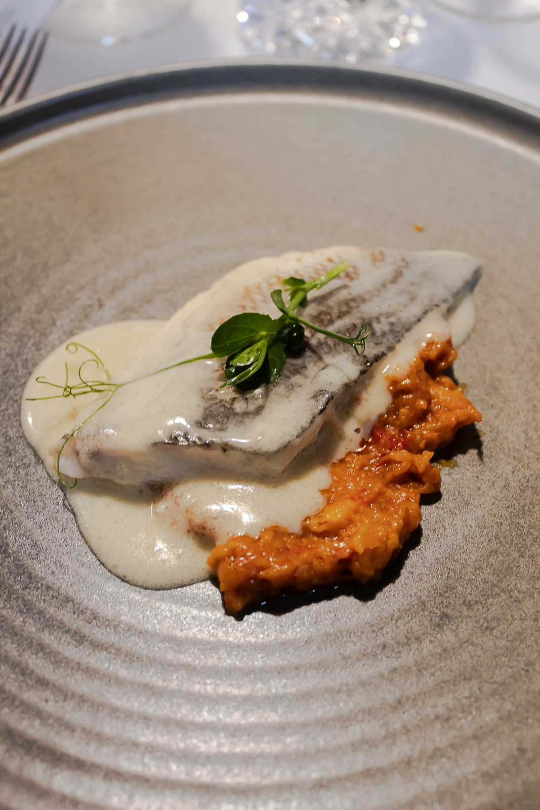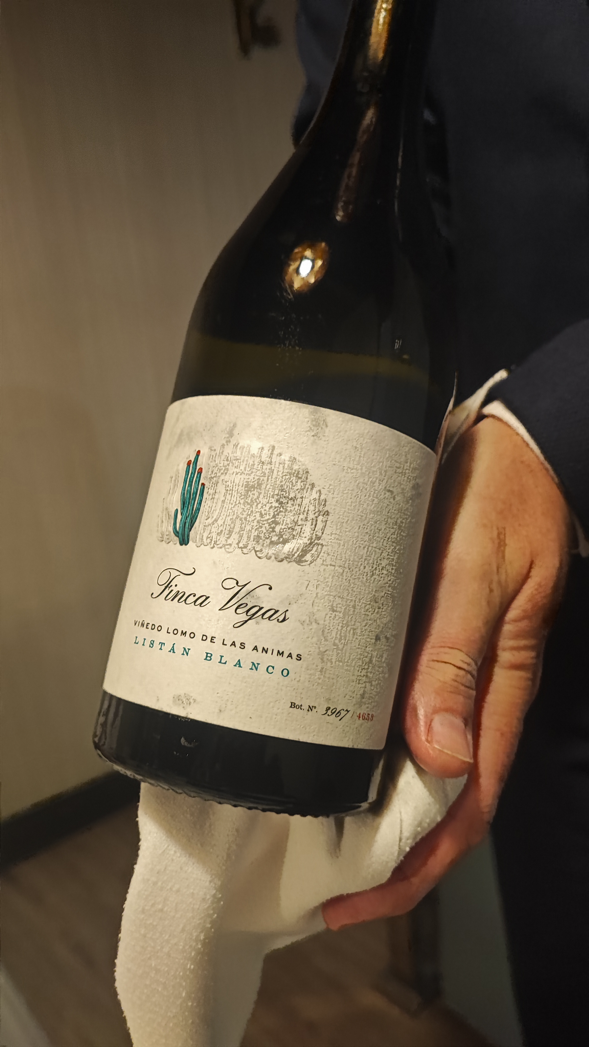 La lubina beurre blanc se convirtió en una experiencia sublime cuando se maridó con el Finca Vegas Listán Blanco de la D.O. Abona, con su acidez equilibrada y cuerpo elegante, complementó perfectamente este plato. Las notas frescas y frutales del vino realzaban los sabores de la lubina y cortaban la untuosidad de la salsa, mientras que su paso por barrica de roble francés añadía una capa de complejidad que armonizaba con la profundidad del beurre blanc. En conjunto, el maridaje ofreció una experiencia completa, donde cada sorbo del vino refrescaba el paladar, permitiendo que los delicados matices del pescado y la salsa brillaran con cada bocado.