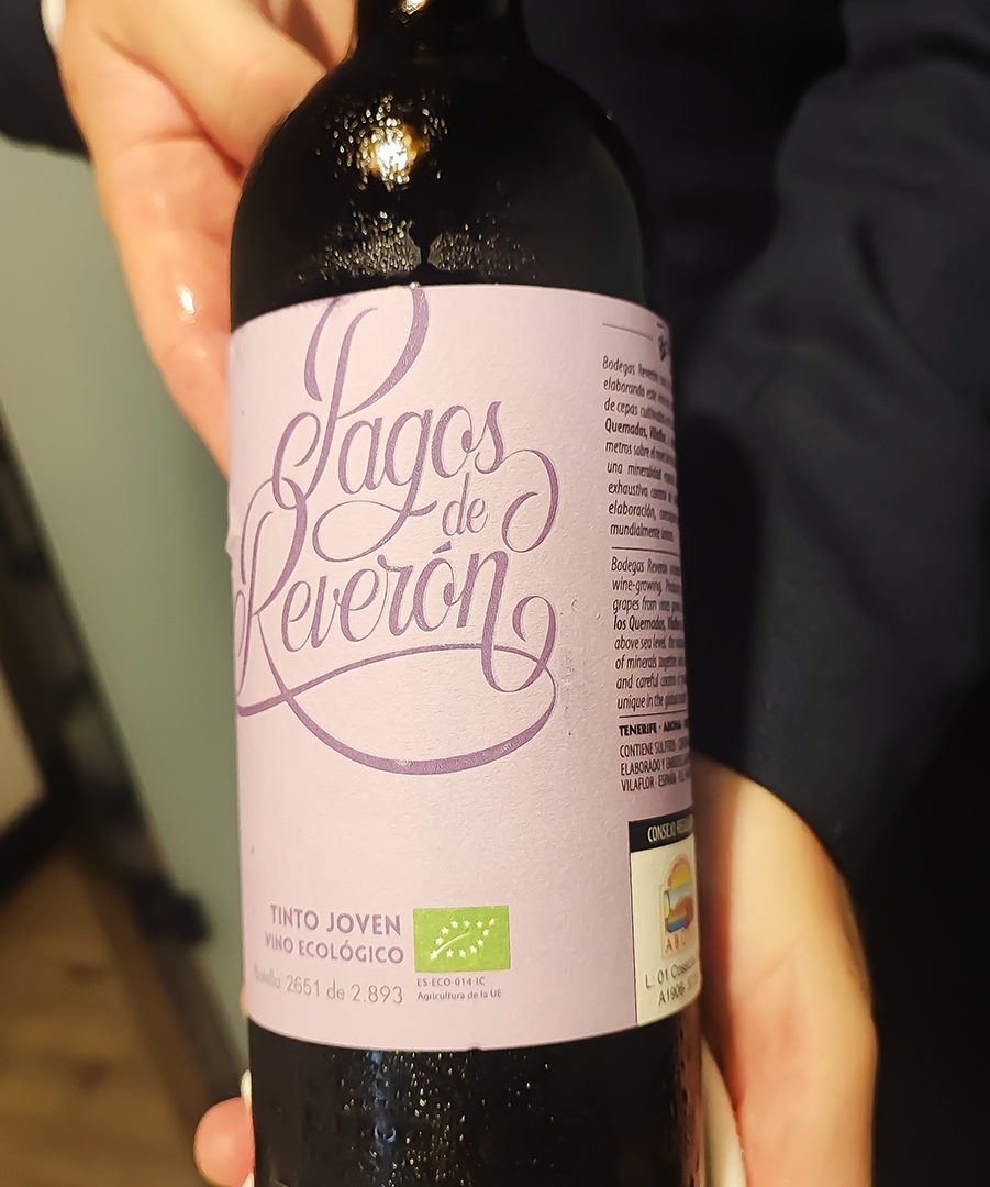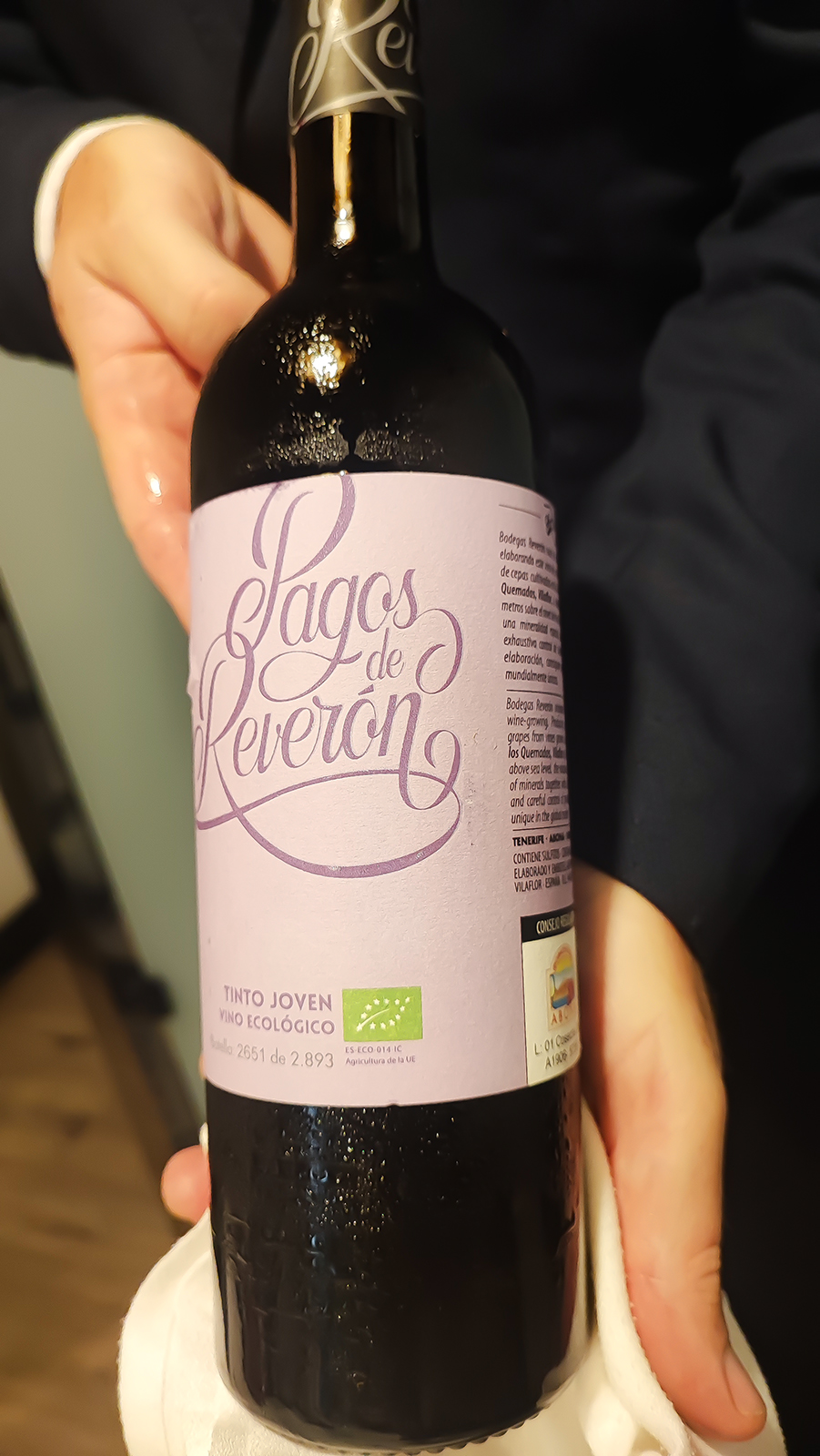 La velada continuó con el conejo, topinambu, setas y tempranillo de Andrés Madrigal. El conejo, cocido a la perfección, mantenía su jugosidad natural, mientras que el topinambu, con su textura crujiente, aportaba un contraste interesante. Las setas añadían una profundidad terrosa que complementaba el vino Pagos de Reverón Tinto Barrica. Este vino, con sus notas robustas y aterciopeladas, realzó la jugosidad del conejo y la riqueza terrosa de las setas. La complejidad del vino, añejado en barrica, complementó las capas de sabor del plato, mientras que su estructura equilibrada aportó un contrapunto ideal a los matices del topinambu y el toque del tempranillo.