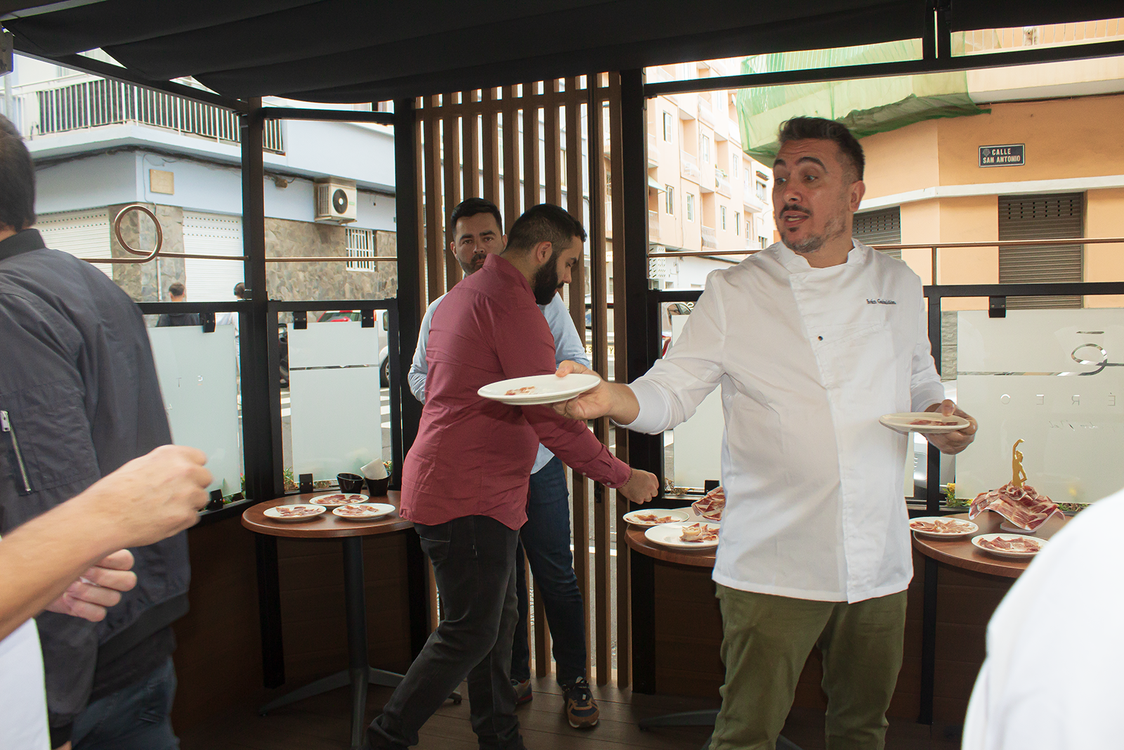 La velada comenzó con una demostración de destreza por parte de Iván Gabaldón, cortador profesional conocido por su habilidad en el corte de Pata de Cochino Negro Canario. Con movimientos precisos, casi hipnóticos, Gabaldón cortaba finas lonchas de jamón ibérico, cada una diseñada para ser disfrutada en un solo bocado. Las lonchas de jamón, con su equilibrio perfecto de grasa y carne, se deshacían en la boca, liberando un sabor profundo y rico que era realzado por el vermut Lacasmi Roio Malvillo.