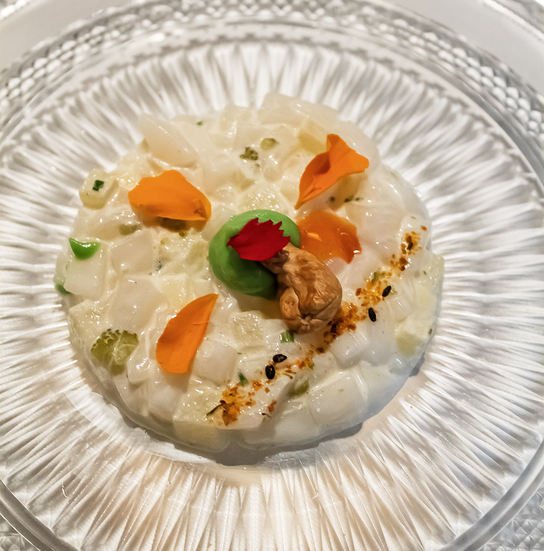 Pedro Nel tomó la batuta con su tartar de vieiras, cremoso de aguacate y reducción de pimiento rojo que destacaba por su delicadeza y equilibrio. Las vieiras, frescas y tiernas, se mezclaban con el cremoso de aguacate, cuya suavidad proporcionaba un contraste perfecto con la textura de los mariscos. La reducción de pimiento rojo añadía un toque de dulzura, realzando los sabores naturales de las vieiras sin abrumarlos.