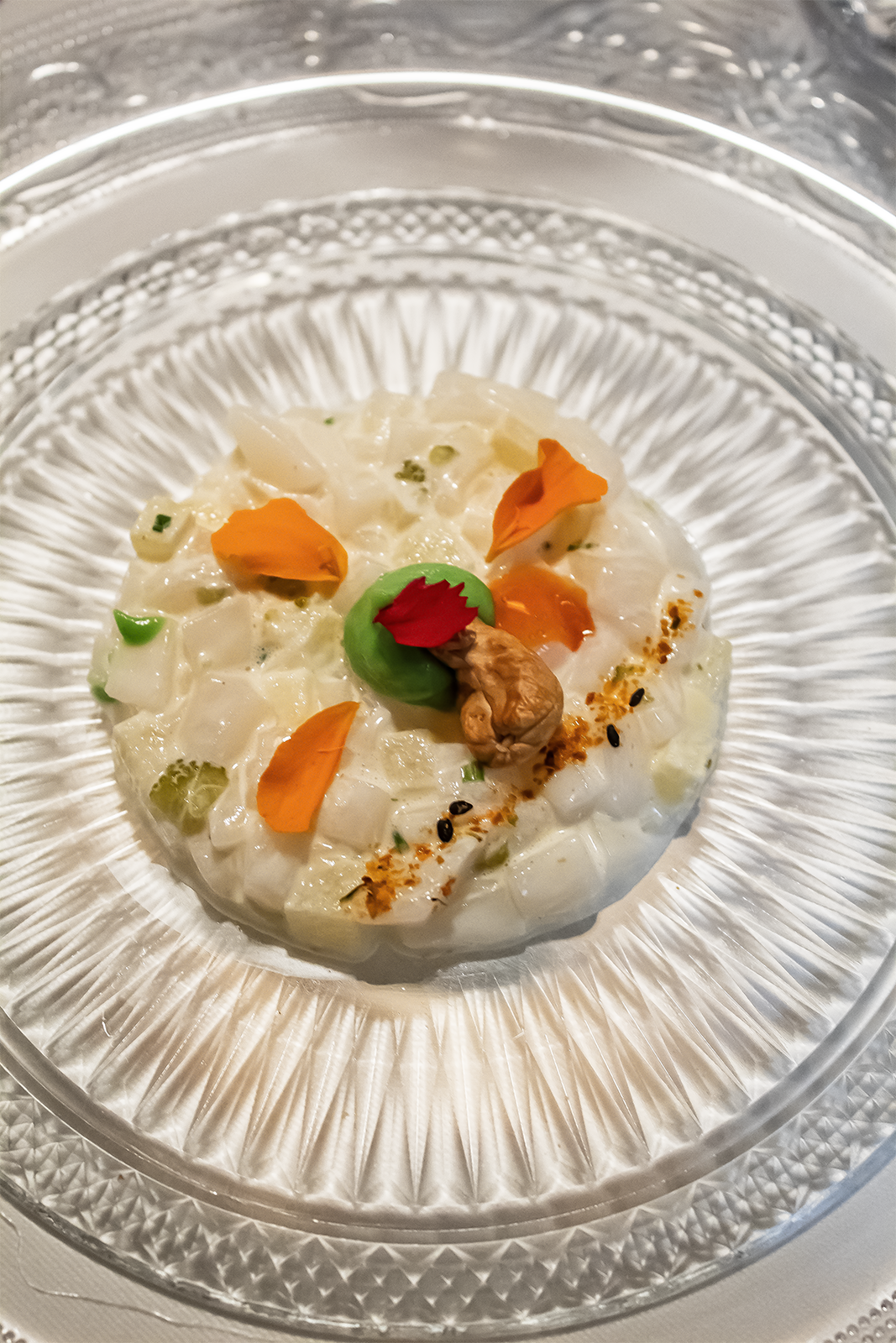 Entonces llegó el primer plato del menú degustación creado por Andrés Madrigal, el mismo que se convirtió, casi de forma desapercibida, en el gran protagonista de la noche. El agua de tomate, pepino y pistacho ofrecía un equilibrio perfecto entre la acidez natural del tomate, la frescura del pepino y el toque terroso del pistacho. Los mejillones escabechados aportaban un sabor marino intenso y bien definido, mientras que la stracciatella, hecha con el premiado queso Don Nicolás de Finca de Uga, añadía una cremosidad y profundidad que complementaba los sabores del plato. El queso, con sus notas dulces a caramelo y textura firme, se integraba de manera armoniosa, creando una orquesta de sabores en cada cucharada.
