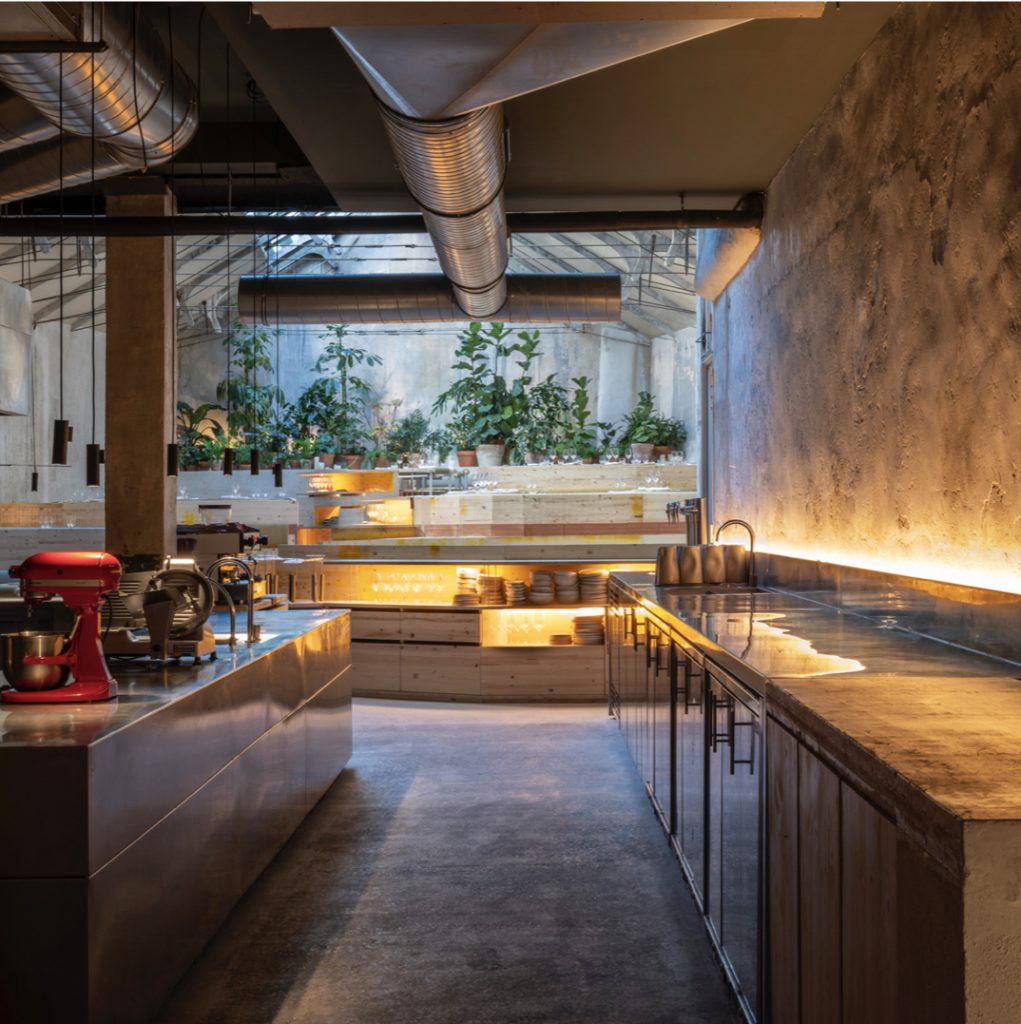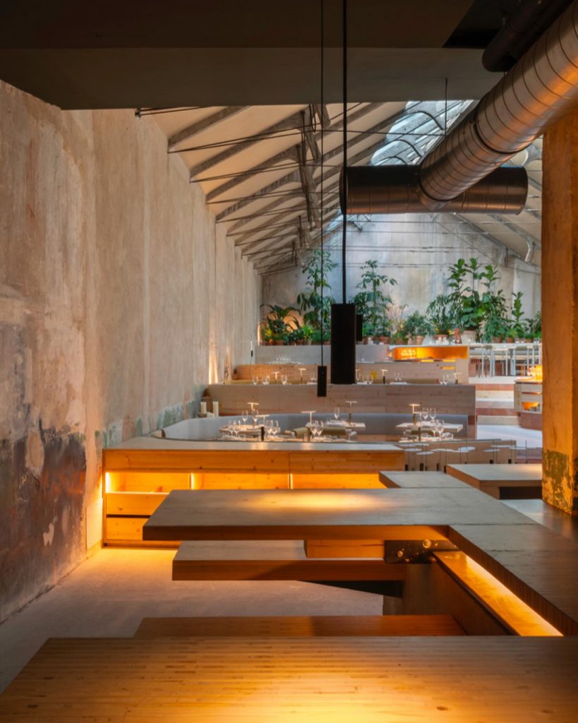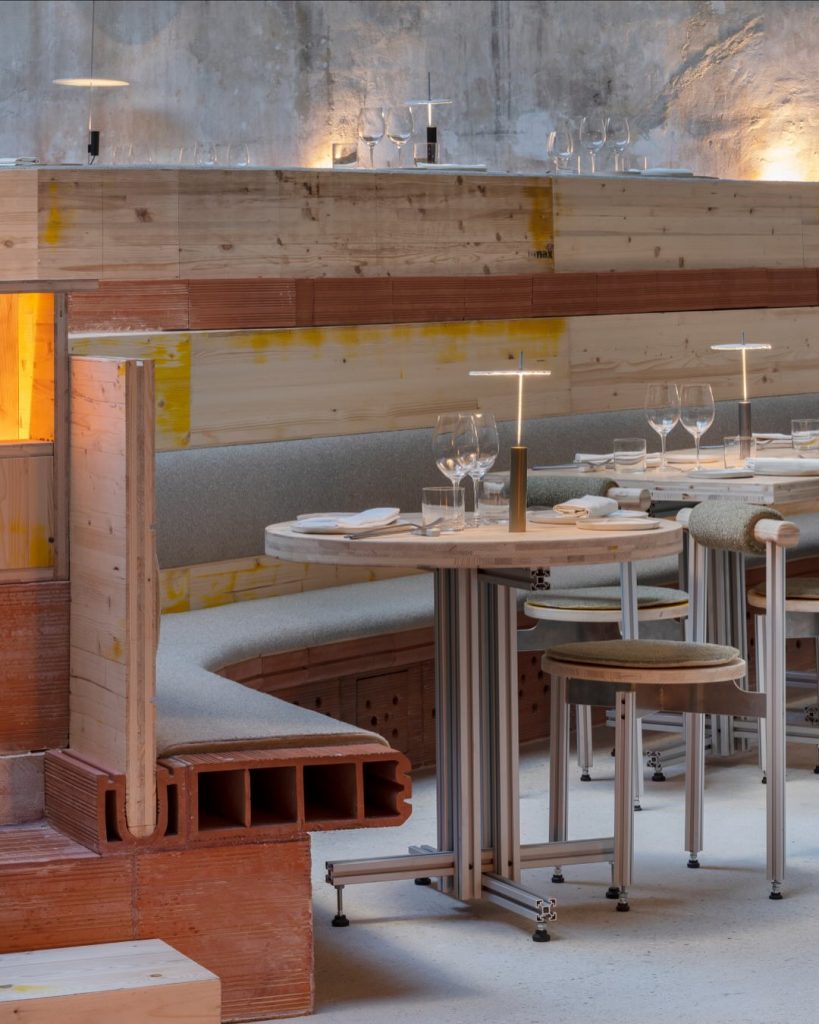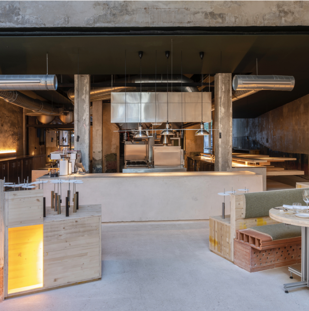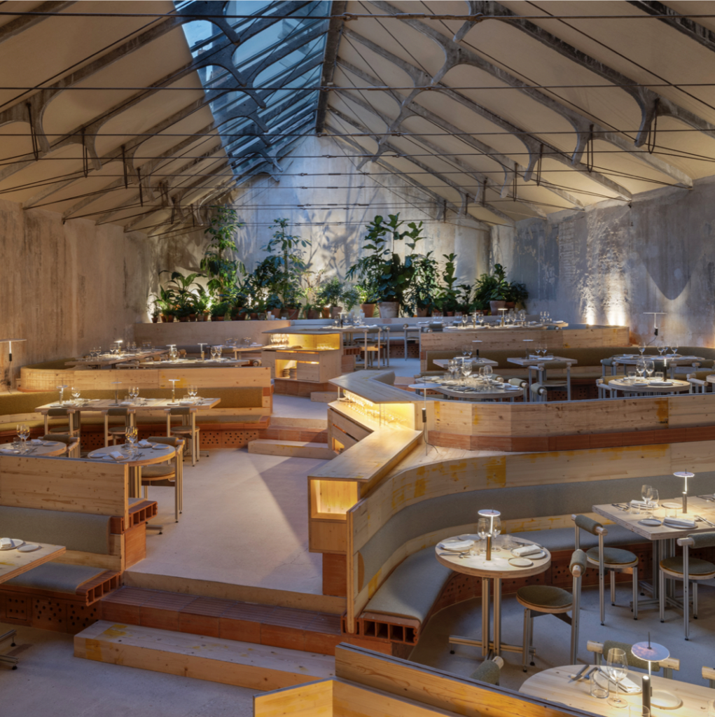 En Madrid, Tramo ha recuperado el antiguo Garaje Hermético bajo normas de bioconstrucción, vajilla fabricada con arena residual de la obra, puertas y mobiliario restaurados y climatización pasiva mediante pozos provenzales. La cocina, de esencia contemporánea, se basa en proveedores locales que aplican técnicas regenerativas en sus fincas.