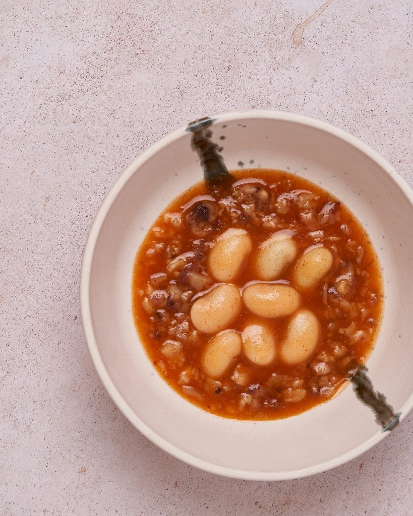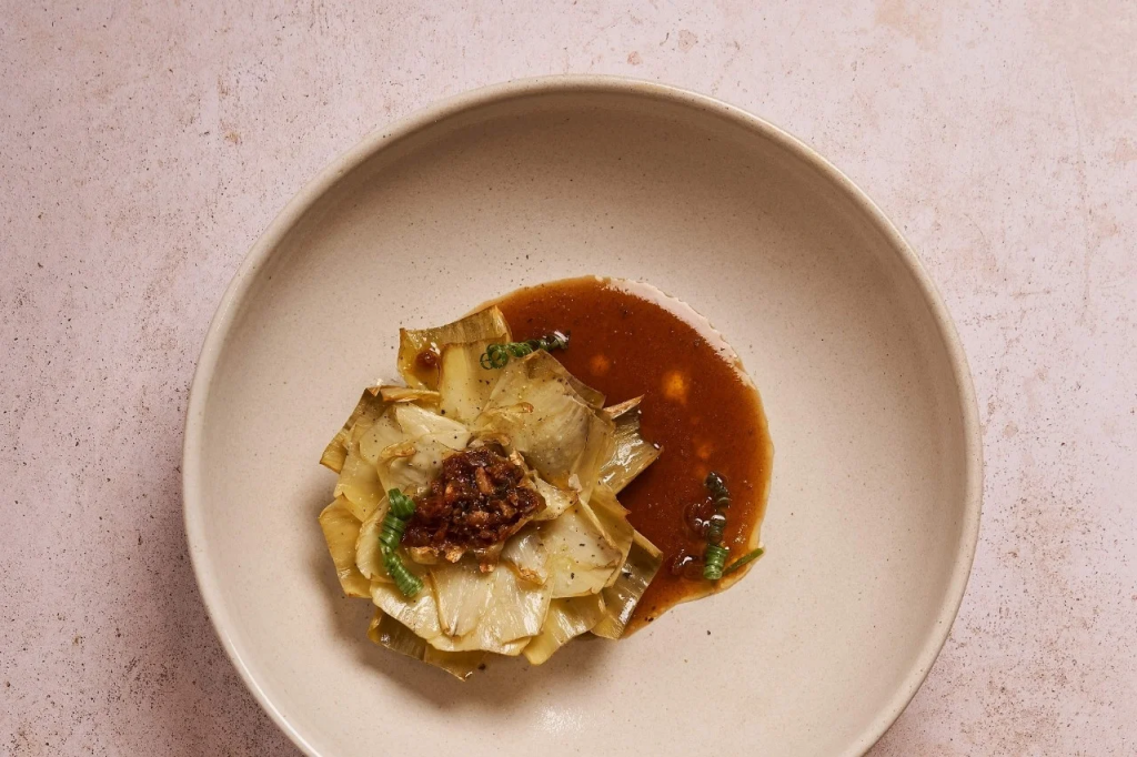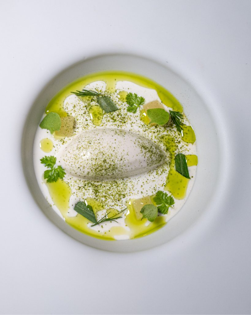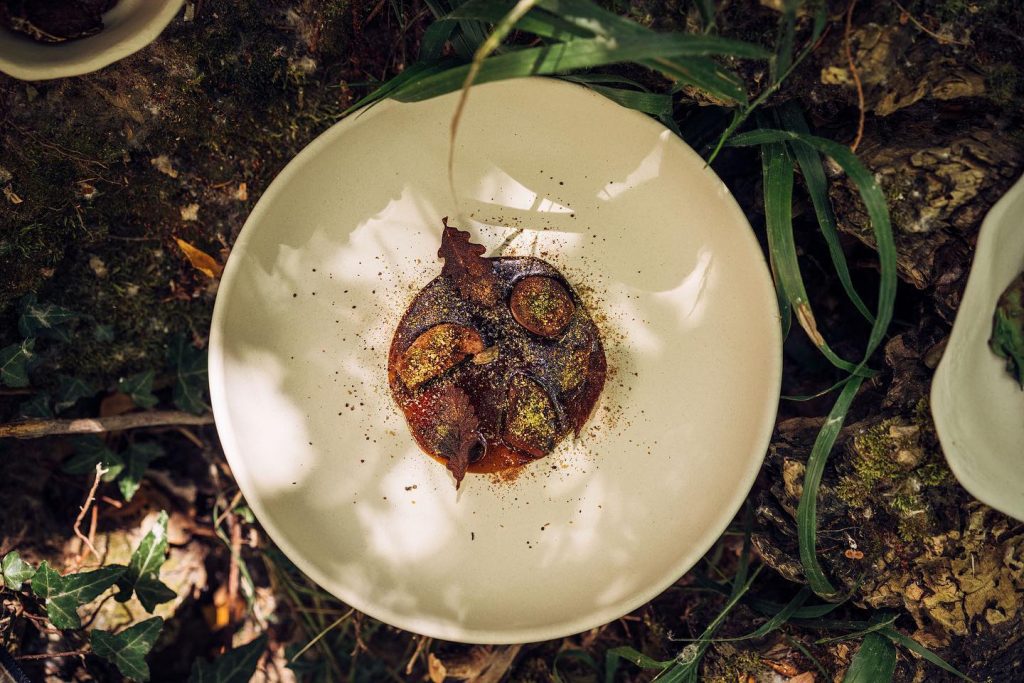 Este postre una síntesis perfecta de estética y ética, no solo cierra el ciclo de producción, sino que construye un mensaje sobre la economía circular. Asimismo, el huerto a pocos metros de la cocina aporta legumbres y hortalizas con sabor auténtico, reforzando la idea de proximidad.