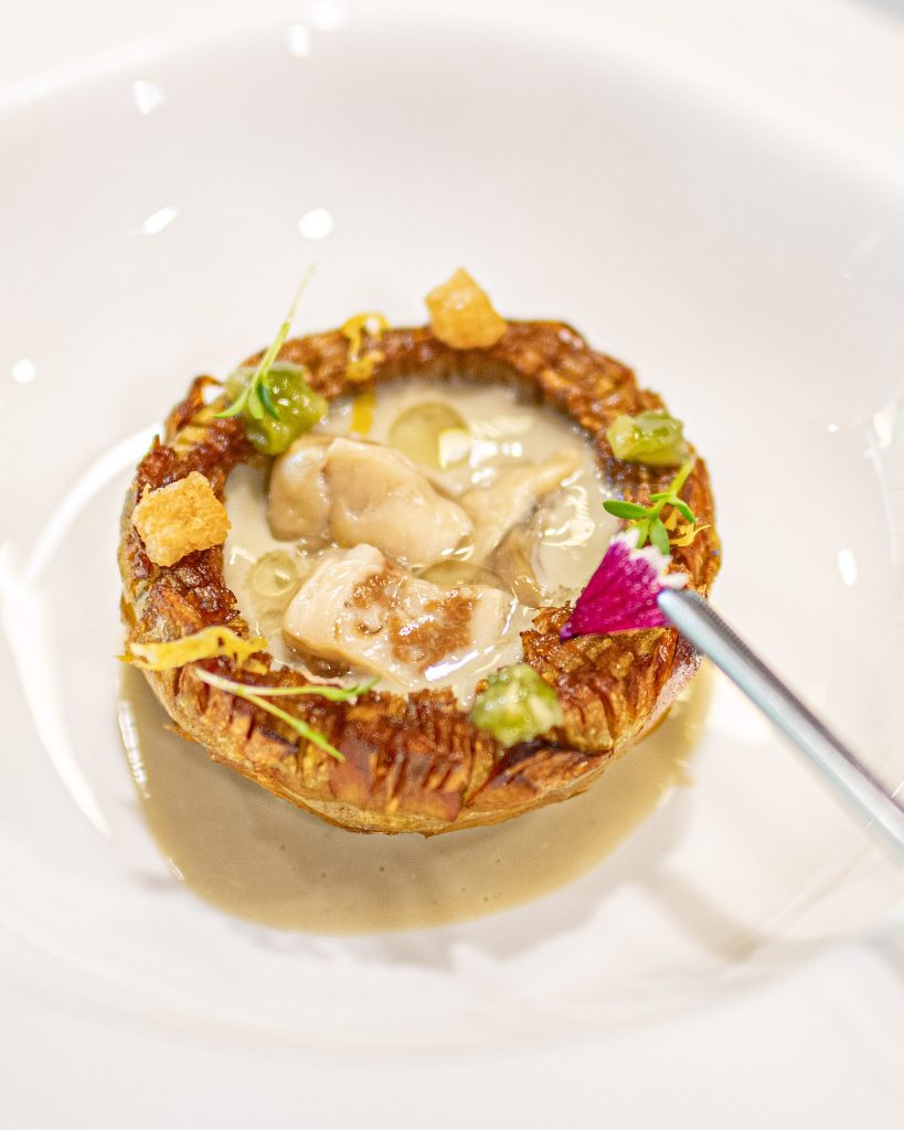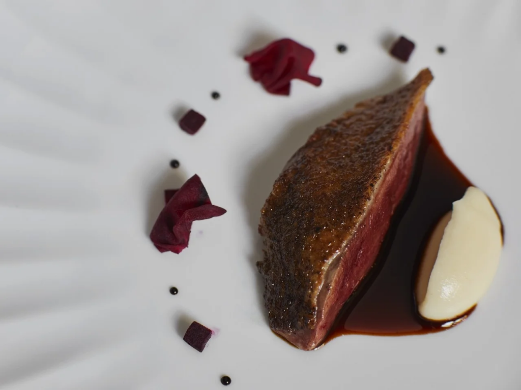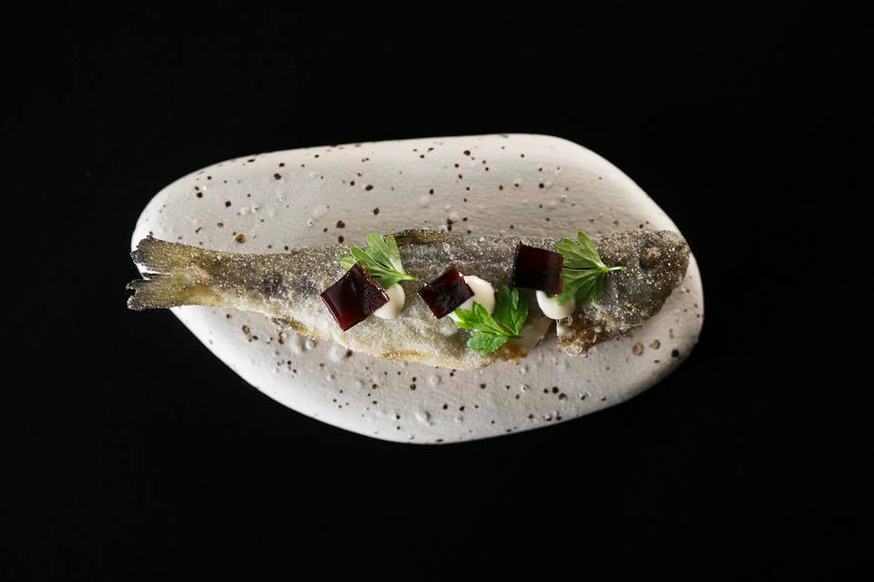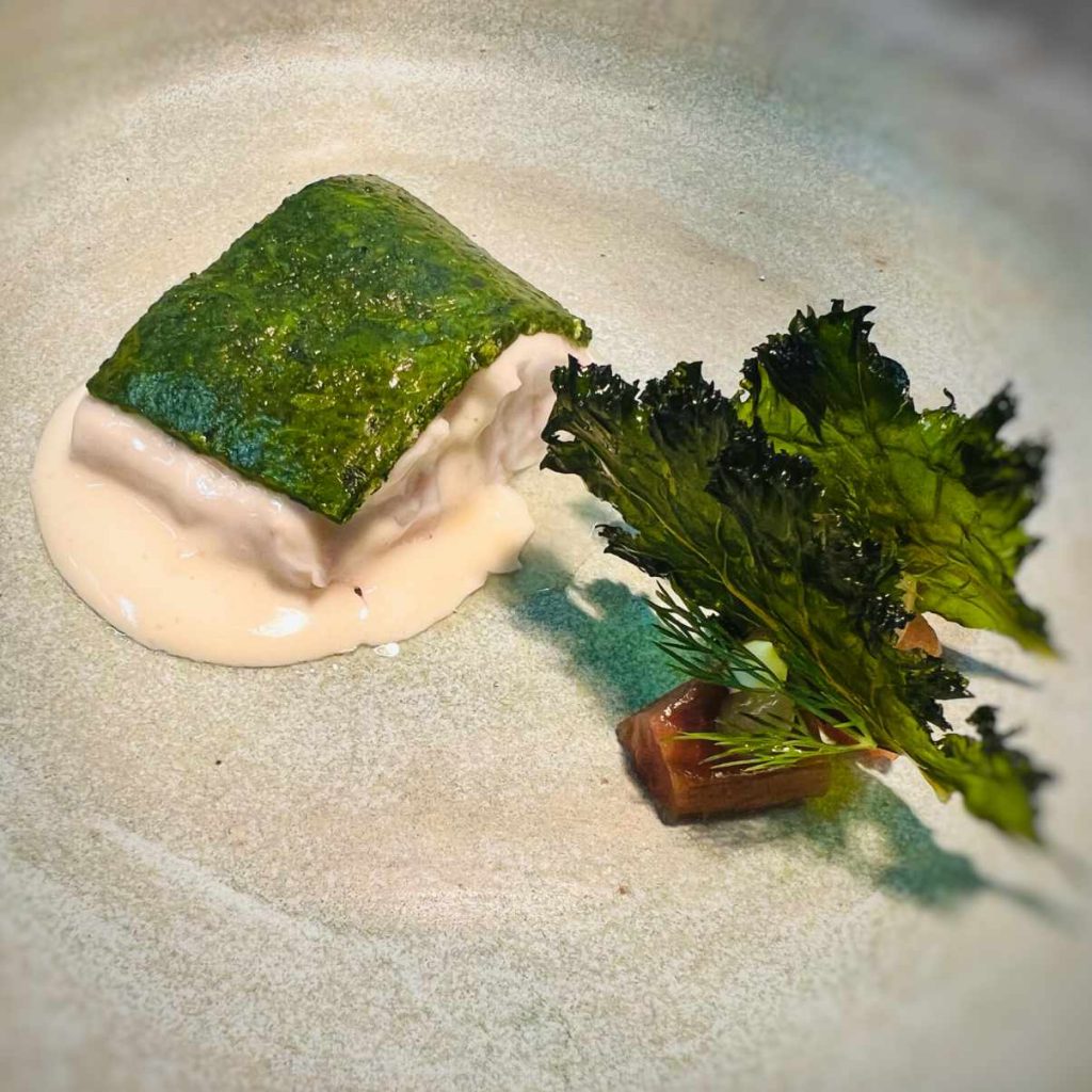 La estética culinaria de Diego Gallegos es a la vez elegante y terrena. Resultan sugerentes la anguila salteada, glaseada con la salsa fermentada de su cabeza, acompañada de un alioli suave y quinoa, y el esturión con cebolla y ajo de caviar. Tras la feijoada de trucha y bagre, otro guiño logrado a la cocina brasileña, llega uno de los bocados más logrados del menú: el queso azul de esturión, elaborado con la vejiga natatoria y el estómago del pescado. A esta preparación, la espirulina y el miso aportan una coloración azul verdosa que realza la riqueza umami. Una creación verdaderamente excepcional.