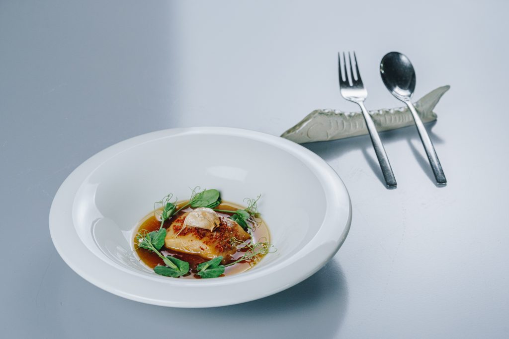 El conocimiento de los fondos se traduce en elaboraciones profundas, el de gallina campera, con su carácter suave y redondeado, y el de shiitake, repleto de matices umami, demuestran que la intensidad del sabor puede lograrse con productos selectos y sencillos. La virtud de Casa Nova radica en la armonía entre estructura y materia prima. Brotes, germinados y pétalos aportan frescor y contraste a platos como la mojama y la caballa, subrayando su textura y realzando su origen marino. En creaciones de carne, el ravioli de pollo y acelga y el rollo crujiente de conejo traducen la riqueza proteica en bocados delicados y sabrosos, donde cada componente dialoga sin desplazar al protagonista.