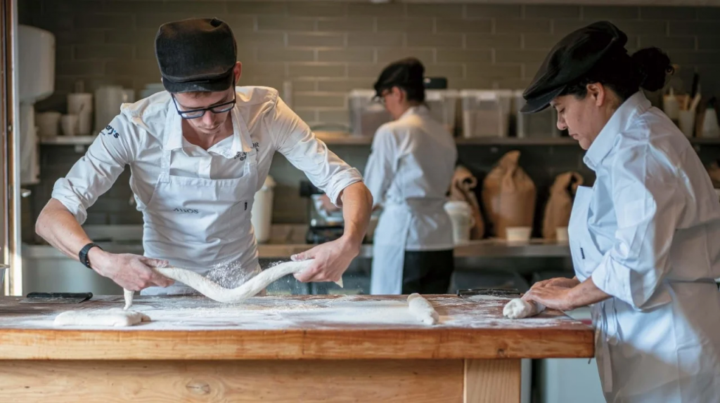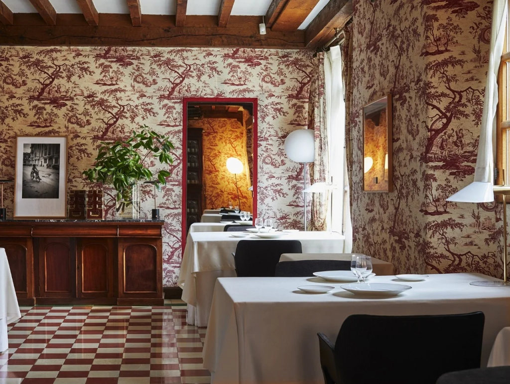 En Cantabria, el Cenador de Amós ocupa una casona del siglo XVIII acondicionada con paneles solares y una comunidad energética que provee electricidad al vecindario. Jesús Sánchez ha incorporado al discurso culinario un postre insólito, el Pan de Amós. A partir de excedentes de pan de masa madre, un proceso enzimático convierte el almidón en una miel densa que se combina con chocolate de origen local, nueces y helado de pan hojaldrado.
