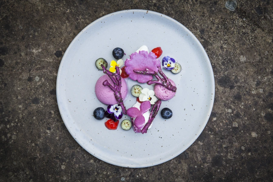 El parfait de violetas es un postre de un intenso color púrpura que combina los sabores florales y frutales de violetas, arándanos, tomillo limón y rosa. Todos los componentes pueden prepararse con antelación, dejando únicamente el montaje final justo antes de servir. Ideal para sorprender en una ocasión especial.