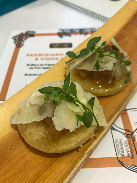 También resultó sorprendente la combinación del más maduro de los quesos, el Parmigiano Reggiano de 72 meses con una gota de Aceto Balsámico Tradicional de Módena, un vinagre con Denominación de Origen Protegida que, al igual que los Vinos de Jerez, se elabora con un sistema de crianza en soleras.