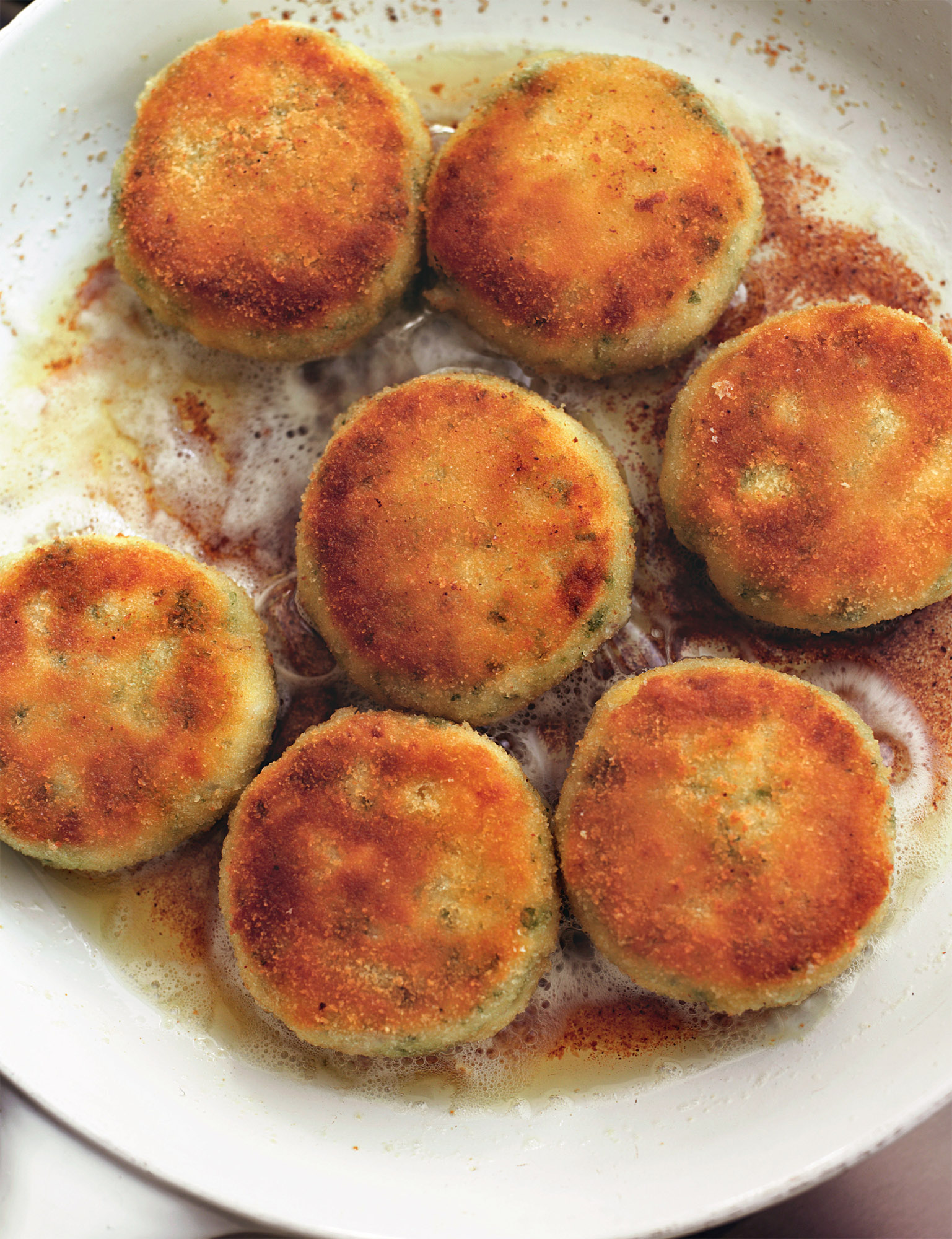 En una sartén grande antiadherente, funde el resto de la mantequilla con una cucharadita de aceite de oliva. Fríe los pasteles a fuego medio durante unos 5 minutos por cada lado, hasta que estén dorados y crujientes.