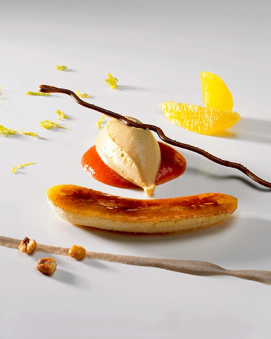 Situar en la parte inferior el plátano caramelizado. Colocar una cucharada de mermelada de guayaba en el plato, disponer encima una quenelle de crema de galleta María. Acomodar el gajo de naranja del país con su piel rallada y hacer trazos de leche y gofio. Por último distribuir el millo sobre los trazos de leche y gofio.
