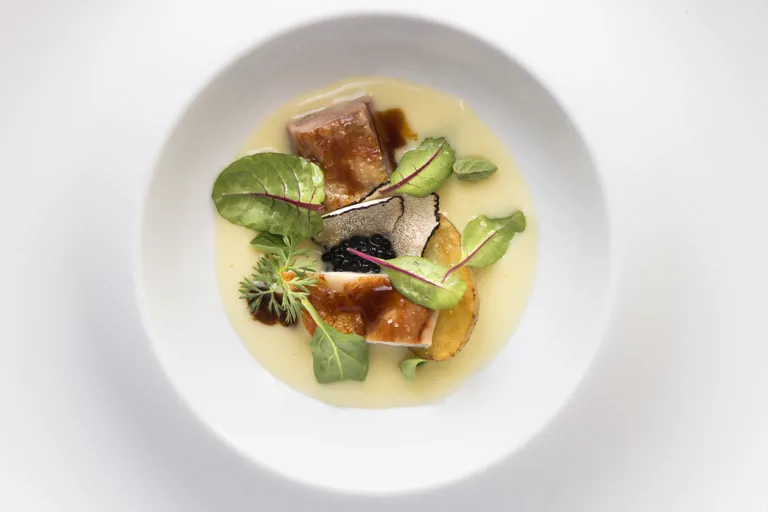¡Disfruta de este exquisito plato de pollo Valdarno, con la suavidad de las papas ahumadas y el delicado toque de la trufa!