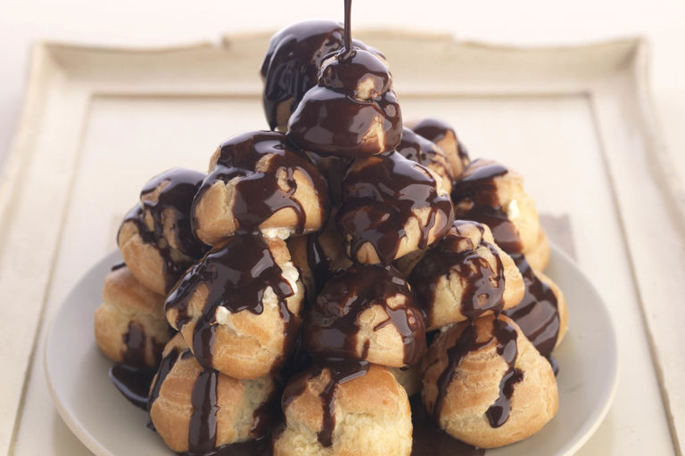 Apila los profiteroles en un plato en forma de pirámide.
