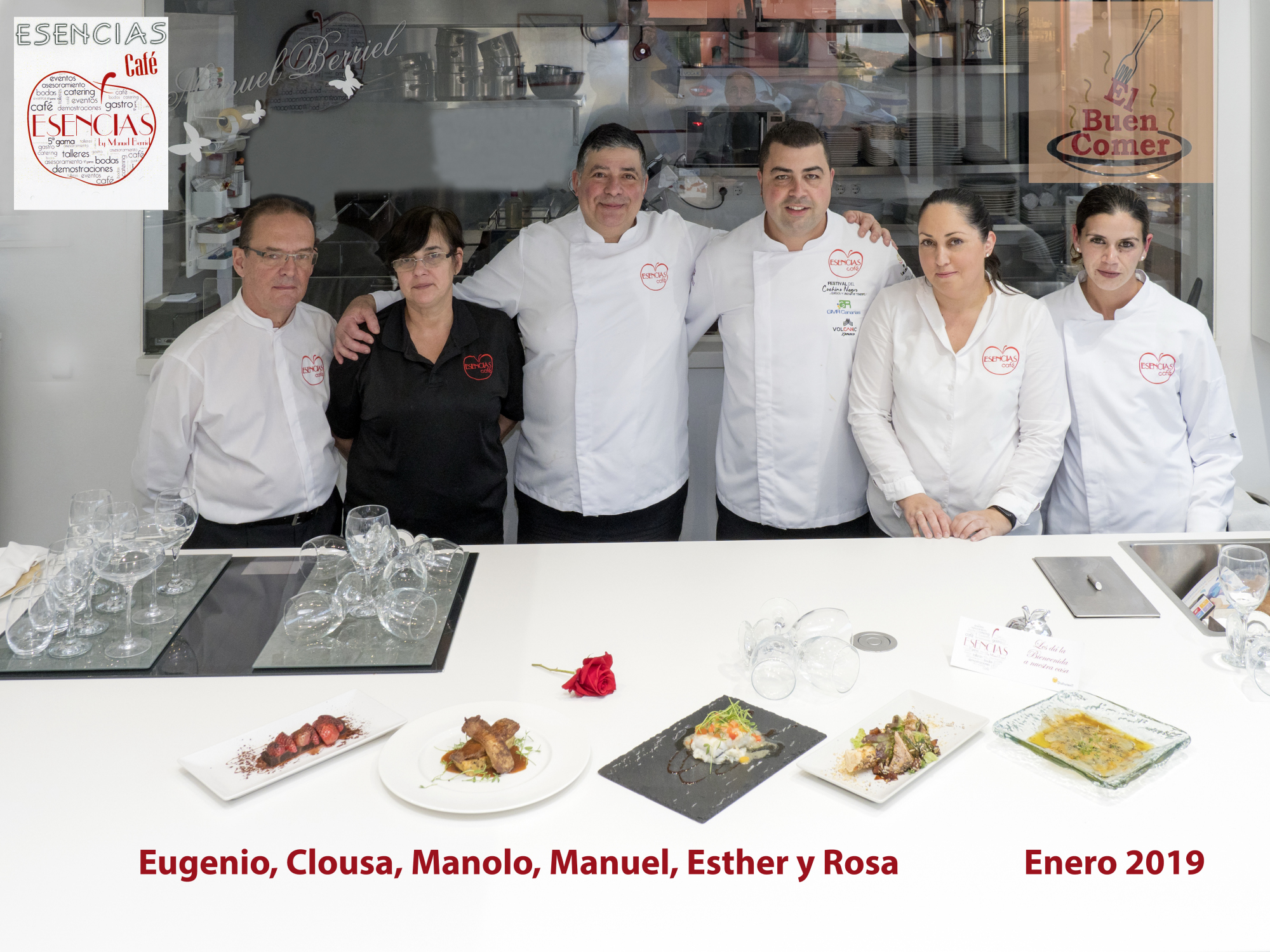 La bienvenida nos la dio Manuel Berriel, acompañado de su esposa Esther Farrais y de Manolo Cabrera, manifestando la ilusión que le hacía nuestra visita y agradeciendo la deferencia que habíamos tenido, los Amigos Canarios del Buen Comer, al elegir, su Restaurante Esencias Café para llevar a nuestra primera actividad de 2019, y exponiéndonos detalladamente la trayectoria del establecimiento, su forma de trabajar los productos, el cariño que vuelcan en lo que hacen, el tiempo que le dedican a diseñar nuevas recetas, etc. para terminar una detallada descripción de cada uno de los platos y los vinos elegidos para la ocasión, lo que propició un efusivo aplauso de todos los asistentes.