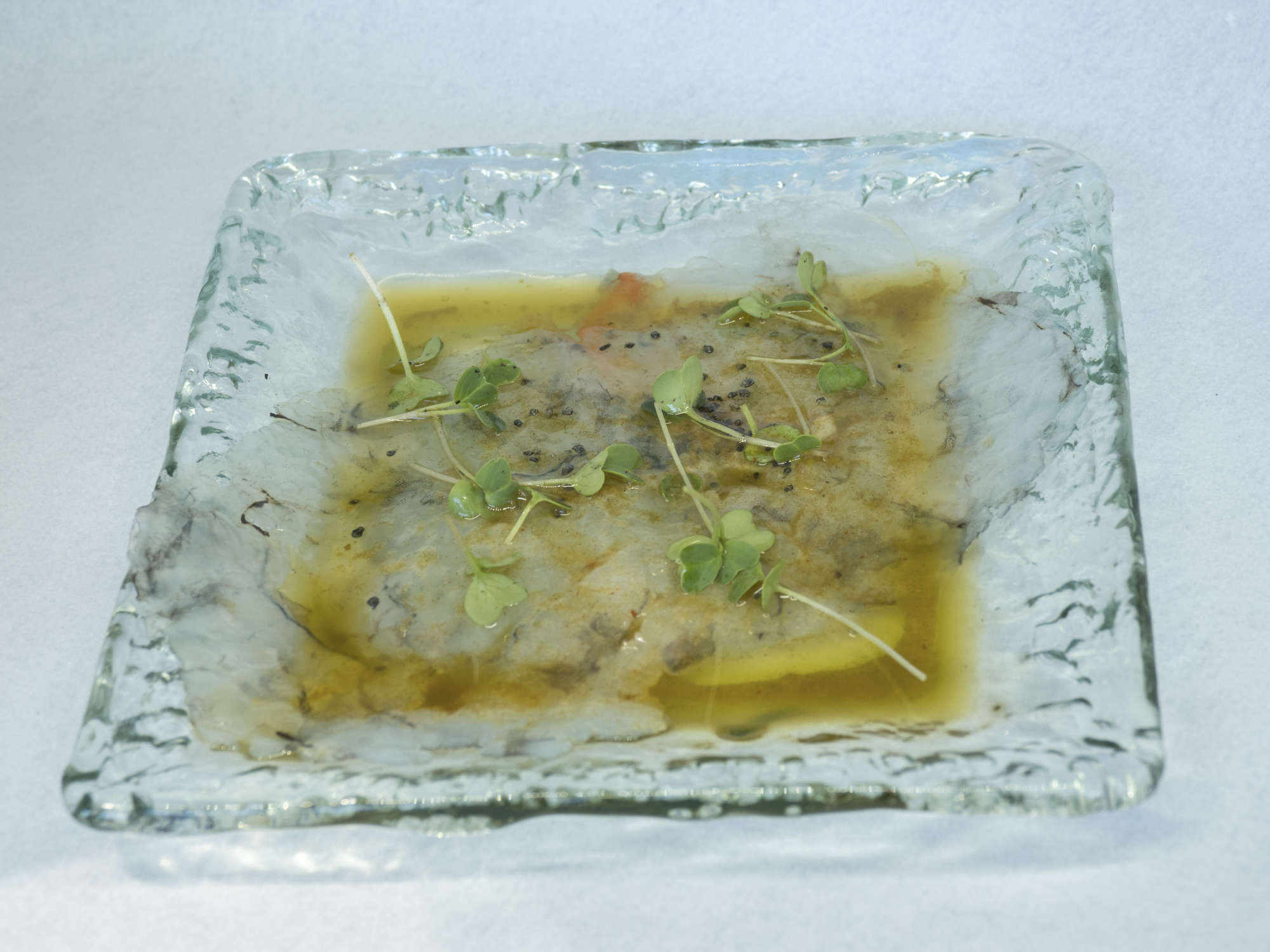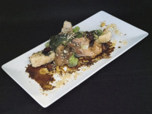 Ensaladita de atún escabechado en casa, hojaldrado de semillas, algas wacame, sésamo y vinagreta de frutas