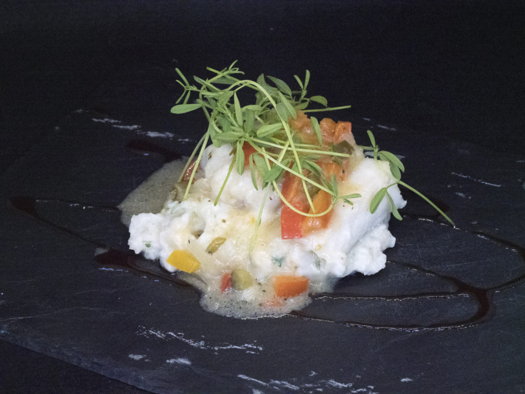 Bacalao confitado, escacho de batatas y miel con fritadita de trío de pimientos con brotes