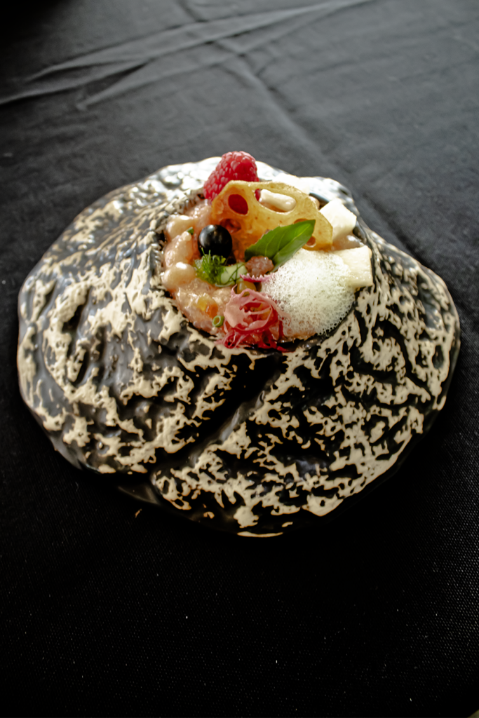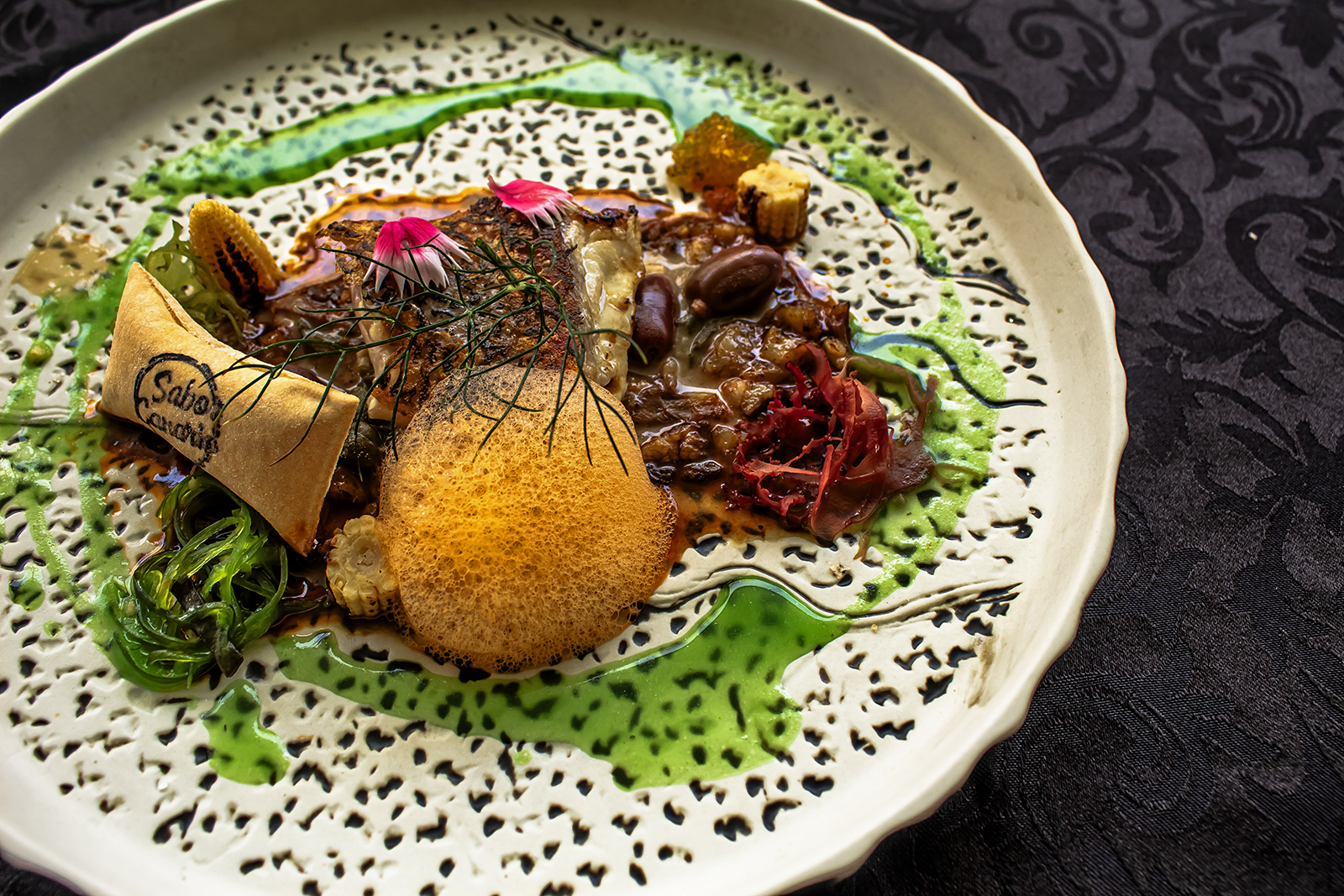 El plato se presenta con un colchón de manitas de cochino negro, caramelizadas, guisadas, trituradas y deshuesadas, ofreciendo una textura gelatinosa. Sobre esta base se coloca un suculento cherne a la plancha, acompañado por un aire de mojo rojo, aceitunas italianas, alga Tosaka roja, y una delicada reducción de espinaca y mandarina china. Para culminar, se añade una reducción de vino blanco y miso, que intensifica los sabores.