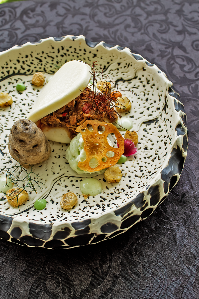 Canalizar las tendencias hacia una identidad propia es una estrategia excelente para diferenciarse. El próximo plato confirma esta afirmación: “Carne Mechada de Cochino Negro en Pan Bao”. Aquí se destaca la especialidad de la carne de cochino negro canario, cocinada a baja temperatura durante 72 horas al vacío. Se acompaña con una espuma de Stracciatella al Alioli, una papa negra y un picoteo final al estilo canario, que incluye maíz tostado con gofio, mini mazorca y, para terminar guacamole con wasabi, como nos comenta Caterina.