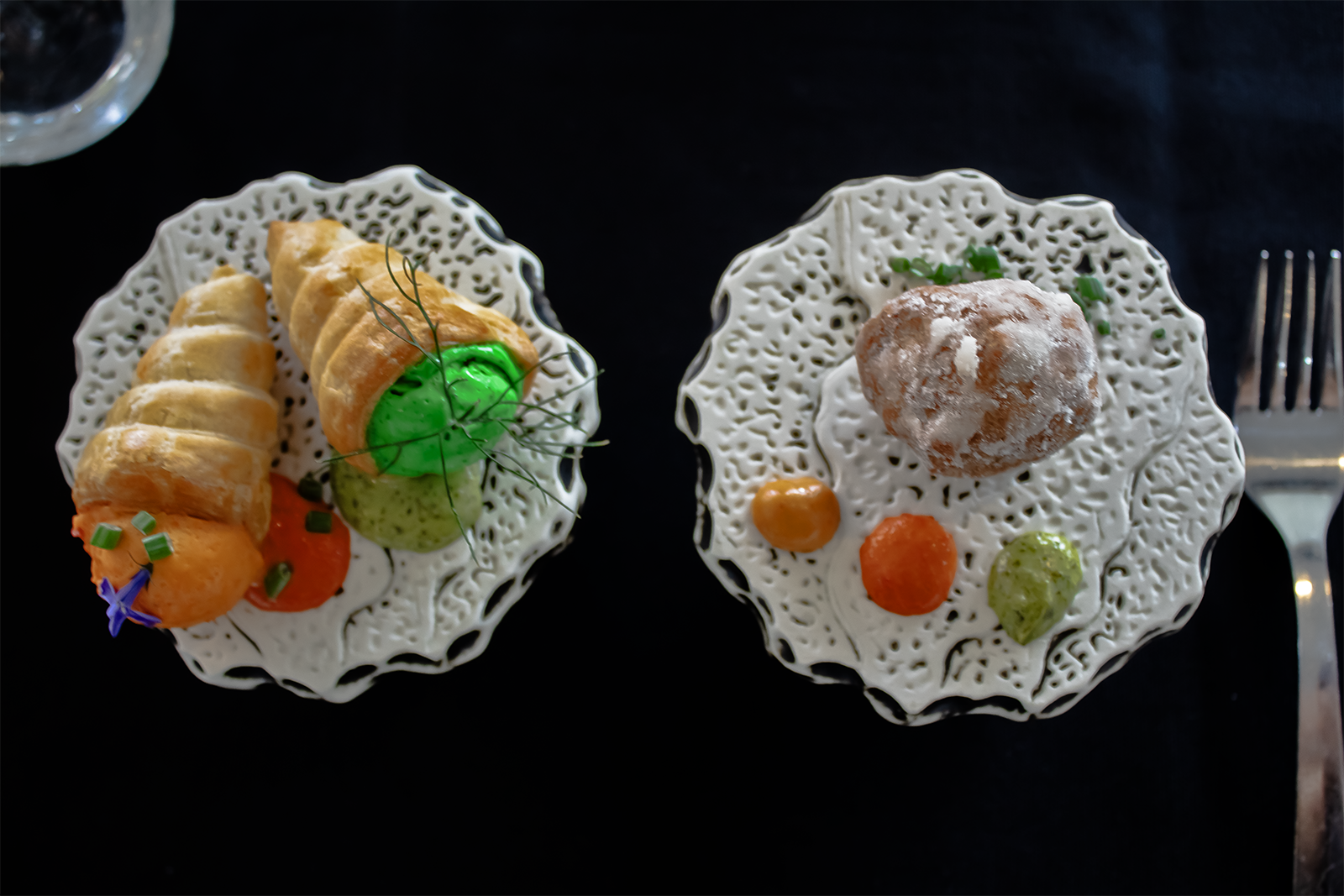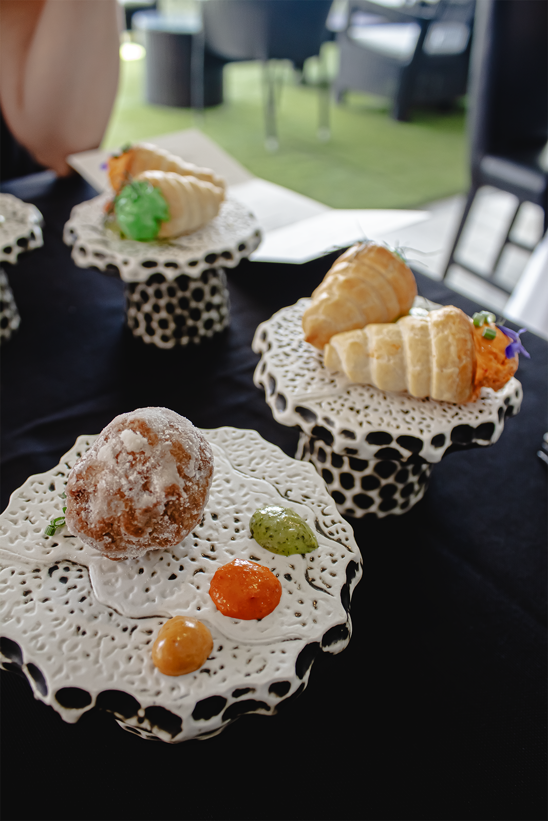 Siguiendo con los entrantes y destacando por su notable creatividad, llegan a la mesa dos “Conos de hojaldre rellenos de mantequilla”, uno de mojo rojo y el otro de mojo verde. Diferentes y muy delicados, presentan una apariencia impecable y en boca, ofrecen una textura agradable y sabores elegantes que no abruman el paladar.