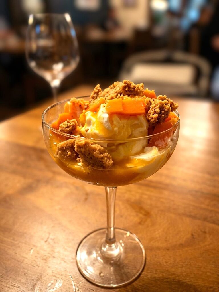 Pero la noche, al menos para quien escribe, tiene una parada muy concreta: las papas, costillas y millo presentadas en copa. Lleva años en el imaginario de Etherington y unos cuantos más apareciendo en sus cartas, allí donde haya cocinado. Yo la conocí hace tiempo, en aquellos días de idas y venidas al Hotel Rural Victoria al que el chef estuvo unido durante muchos años, y confieso que sigue produciéndome la misma mezcla de curiosidad y consuelo. No porque sea un plato efectista —no lo es—, sino porque resuelve muy bien una operación delicada; reinterpretar una receta popular sin romperle el alma.