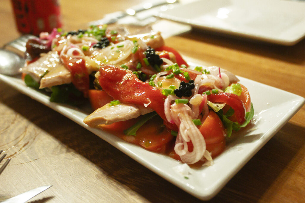 Esa medida entre tradición y criterio aparece ya en algo tan aparentemente simple como unos tomates aliñados con ventresca de atún. Merece la pena parar un momento ahí, porque los platos sencillos suelen ser los que mejor retratan una cocina. Ahí no hay espuma que distraiga ni montaje que confunda; hay producto, equilibrio y honestidad. El tomate canario, con esa pulpa carnosa, ese dulzor contenido y esa acidez bien domada, ha sido mucho más que un ingrediente en la historia de las islas. Fue economía, paisaje, trabajo, estructura social, una de esas columnas sobre las que Canarias también se contó a sí misma durante buena parte del siglo XX. Cuando llega bien tratado a la mesa, llega también una memoria agrícola entera. En El Sorchante aparece fresco, rico, con el punto exacto de acidez, acompañado por una cebollita roja dulce de la isla y la untuosidad precisa de la ventresca. No hay exceso, hay medida. Y la medida, cuando es buena, también emociona.