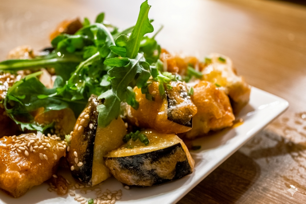 Luego están las berenjenas en tempura con rúcula aliñada y sésamo tostado, que resuelven una vieja disputa: la berenjena divide el mundo entre amantes, detractores y tibios diplomáticos que dicen ‘depende’. Aquí depende poco, porque está hecha para quererla. Lo que Etherington logra con ella no admite demasiada retórica: crujiente por fuera de verdad —no en ese sentido generoso con el que a veces se usa la palabra para no herir susceptibilidades— y cremosa por dentro. La combinación dulce y salada está bien pensada, la rúcula refresca y el sésamo redondea el conjunto con un eco tostado que se queda lo justo. Son bocados de esos que obligan a moderar la educación, porque el brazo quiere volver al plato antes de que termine la frase.