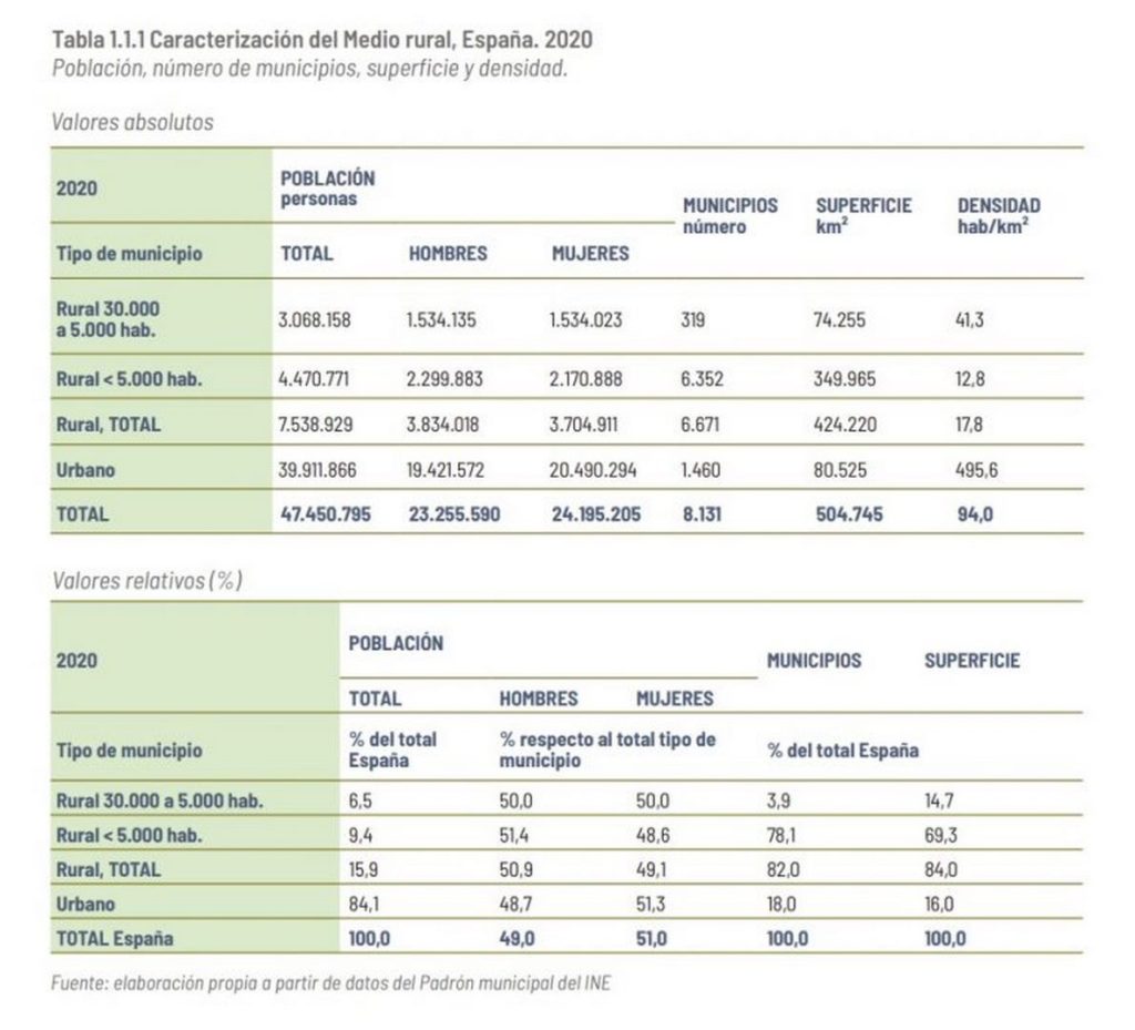 Con estas premisas, la España rural reúne al 82 % de los municipios españoles; son mayoría los más pequeños -los que tienen menos de 5.000 habitantes-, ya que suponen el 78,1 % de ellos, mientras que solo 319 pueblos (el 3,9 % restante) poseen entre 5.000 y 30.000 habitantes.
