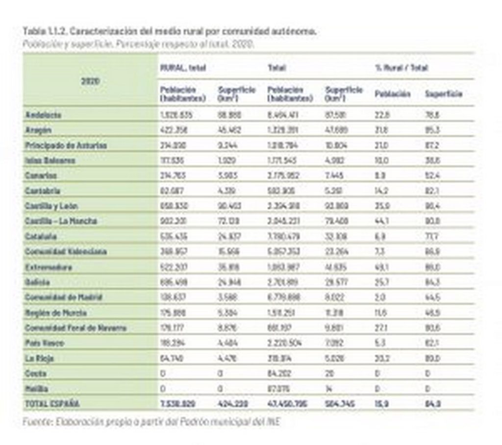 Extremadura es la comunidad autónoma con un mayor porcentaje de población rural (el 49,1 % del total, 522.207 personas) y Andalucía la primera región en valores absolutos (1.926.635 personas, el 22,8 % de su población).