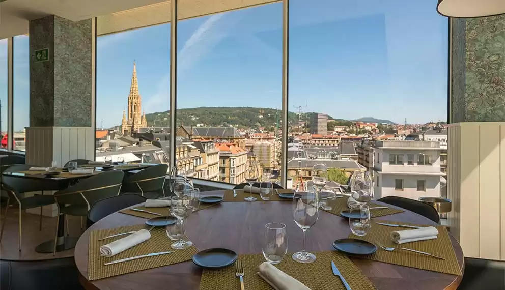 Por otro lado, el Hotel Catalonia Donosti es una elección perfecta para aquellos que deseen estar cerca del Palacio de Kursaal durante San Sebastián Gastronomika. Ubicado a solo 6 minutos en coche, este encantador hotel ocupa un antiguo convento con una fachada histórica y ofrece una experiencia boutique con una decoración de estilo inglés y materiales nobles. Su rooftop con terraza, piscina y solárium ofrece impresionantes vistas de San Sebastián y el mar Cantábrico. Además, el Aldapeta Gastrobar del hotel sirve exquisita txuleta a la brasa y una selección de vinos, para disfrutar de la gastronomía vasca.