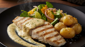 Cherne a la brasa con mojo de almendras, papas arrugadas y ensalada tibia de berros