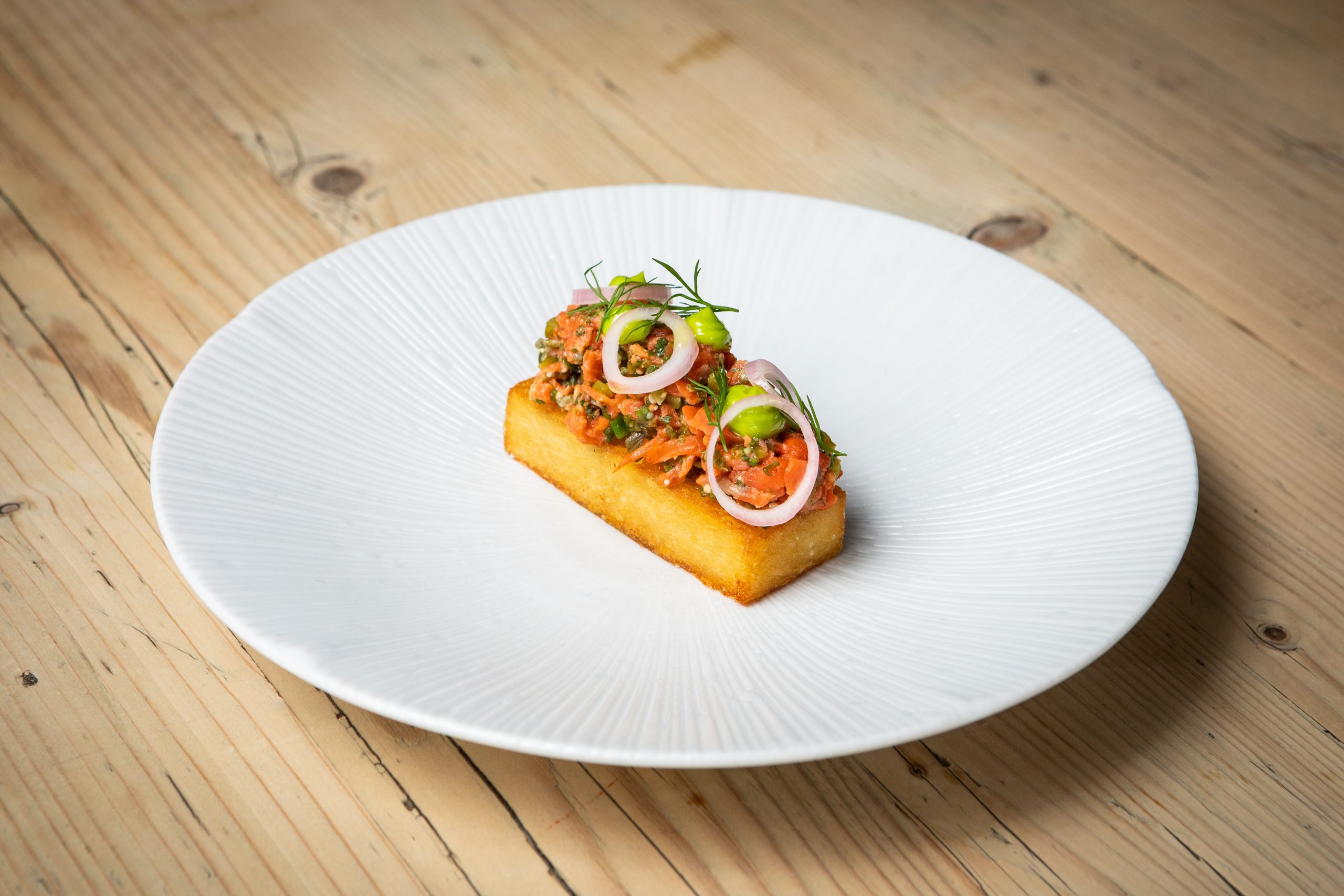 Mezclar el salmón picado con el aliño y sirve sobre el rosti de papa, con las chalotas encurtidas y puntos de emulsión de eneldo. Decora con eneldo fresco.