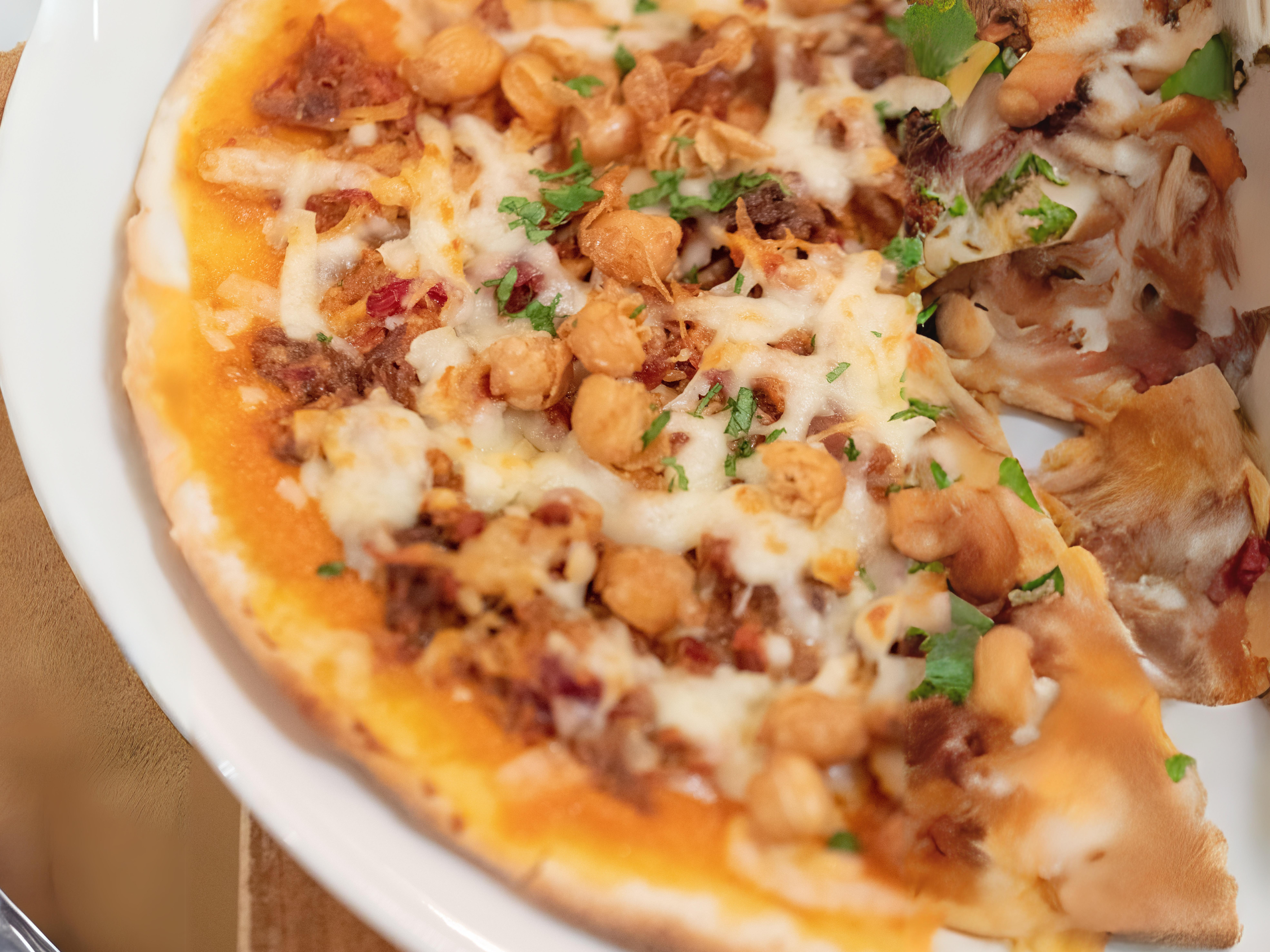 El toque final lo aportan los garbanzos fritos, que se esparcen sobre la pizza, aportando una textura crujiente y un sabor que realza el conjunto.